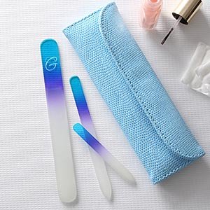 File this one under a great gift idea--for yourself or someone else!Durable glass nail files provide long-lasting use and will quickly and effectively shape natural and artificial nails. Tough enough to tackle calluses and hardened skin on the heels, yet gentle enough to use on brittle nails. We artfully etch her single initial monogram in the beautiful script font shown, for a personal touch to call her own! Includes 7"L pedicure file, 5-1/2"L manicure file, 3-1/2"L travel-sized nail file and protective case. Clean with soap and water. The beauty of crystal glass nail files is that they will last forever, they won't wear down from use, and your fingernails will look better than ever!Makes a great bridesmaid or birthday gift and so much more!