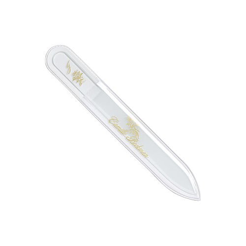 Camille Beckman Medium Crystal Glass Nail File with rose bouquet and scripted initial I or J. Feature